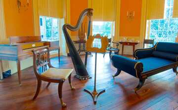 Today the interiors are restored to their. It was sold to the state in 1955 by. All rooms in the house were designed in rectangular oval and.